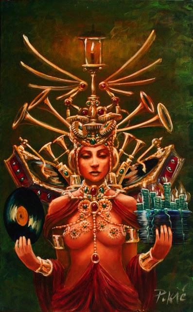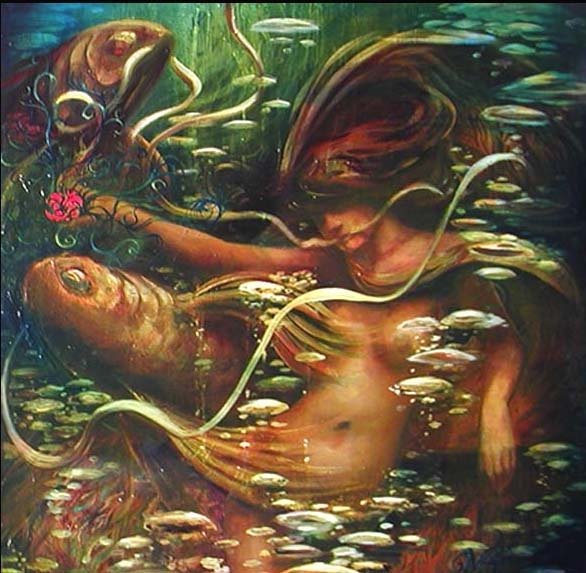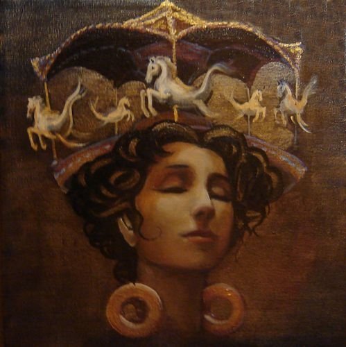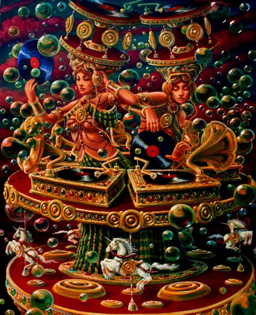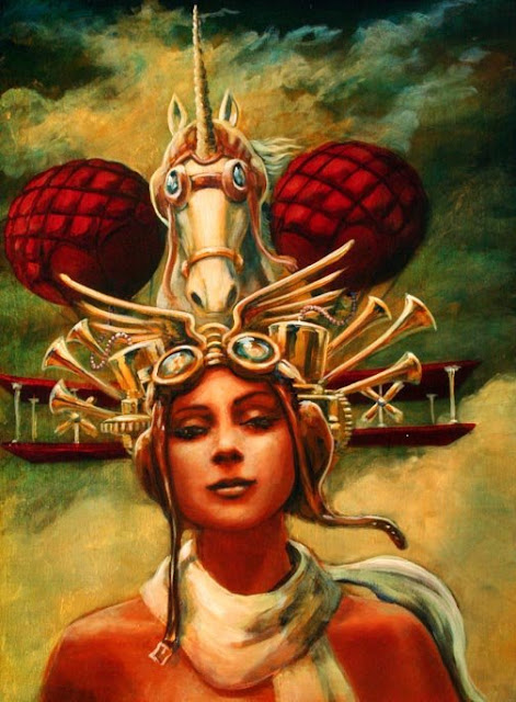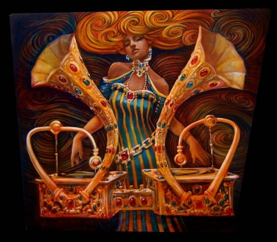 En primer lugar, "lo que" yo pinto, son-como la diosa, el santo-como las mujeres en situaciones o momentos que parecen provenir de algún mito extraño o una historia que usted desea que usted ha oído. Me tire de un aluvión de románticos y "pictóricos" épocas de arte que reflejan nuestra propia: barroco, rococó Ashcan, y Art Nouveau. Estoy muy influenciado por otros medios creativos, incluyendo la película (todo tipo de animación, los años 50, 60'sclassics y documentales sobre la cultura), teatro (Shakespeare, musicales, vanguardistas), música (blues, clásica, hip hop, jazz, folk , y el rock n 'roll) y de la literatura (Twain, Hemingway, y Robbins.) Todos parecen añadir a la colisión de un modo u otro. Me encanta hacer cuadros alegres de corazón - pero irracional. Son como absurdos románticos o adivinanzas bien habladas sin respuesta - anti-narrativas. Por ejemplo, el enigma popular por Lewis Carroll, "¿Por qué se parece un cuervo a un escritorio?". Es una frase hermosa y es un enigma que realmente quieren ver resuelto, pero la respuesta es no, obviamente, la próxima. En cierto modo, ese es el tipo de imagen o escenario que me gustaría crear. Es un equilibrio entre el misterio y la accesibilidad. Mis pinturas se puede ver como algo divertido, divertido, o muy en el exterior, pero esto es sólo una herramienta para atraer a mi público a un mundo de mitos mezclados y emparejados y la cultura, los gags literarias, homenajes a grandes obras de arte, las metáforas sexuales, los actos de la inutilidad manifiesta, comentario social y un lugar donde no hay respuestas claras.