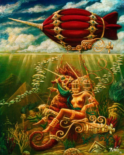 Su trabajo toma el sol en la tierra de potencia zeplins unicornio, el narval persecuciones, aventuras submarinas de buceo, DJ girando sobre viajes en globo, y tocadiscos de caballitos de mar. Cierra los ojos y nadar en un país de las maravillas steampunk Atlántida. Pukac crea pinturas alegres llenos de absurdos románticos para completar épicas contra-narrativas que existen en el aire o en el mar.