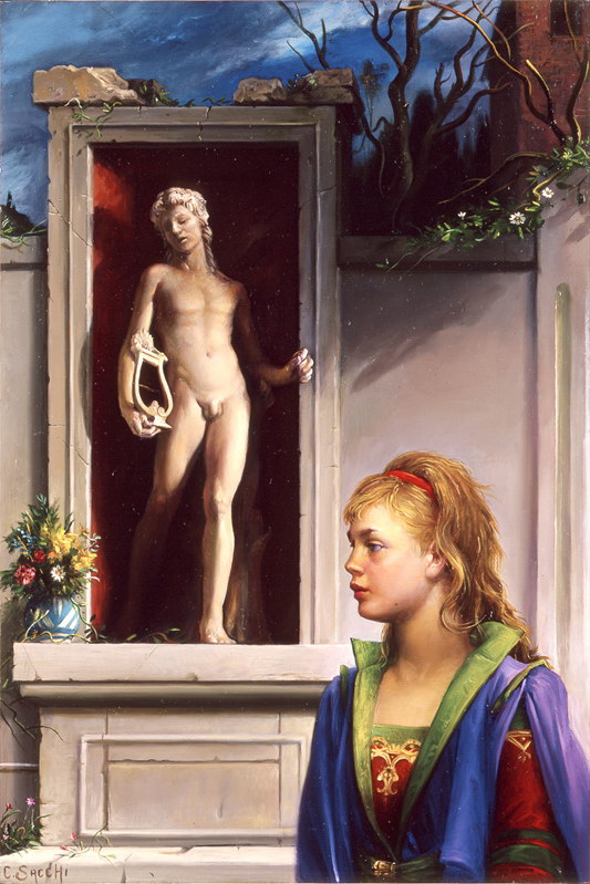 . Claudio Sacchi nació en Pesaro el 19 de diciembre de 1953. Inicialmente estudió en la Escuela de Arte de Urbino, continuando sus estudios en la Academia de Bellas Artes de Florencia.Fundamental para sus reuniones de capacitación se llevaron a cabo y la asistencia de Peter Annigoni desde 1973 y Enrico Del Bono desde 1977. Desde 1977 se ha incluido en el archivo del Kunsthistorisches Institut de Florencia por el arte italiano del siglo XX. En 1979 colaboró con el Centro de Investigación y Extensión de la técnica de las artes de Mario Donizetti de Bergamo.De 1980 a 1982 fue profesor de pintura en la Escuela de Restauración Spinelli de Florencia. De 1989 a 1992 trabajó en los diseños con la revista "Florence Ayer, hoy y mañana", publicado por periódicos Newton. Desde su primera exposición individual en 1977 en Florencia, ha expuesto en las principales ciudades italianas (Milán, Bolonia, Génova, etc.) Y en el extranjero en Amsterdam, Mónaco, Monte Carlo, Niza, Cannes, Gent. Muchas de sus pinturas y dibujos han sido publicados en las principales revistas y libros. Él a menudo han empleado los periódicos italianos con los artículos que criticaban especialmente positiva. Ha pasado largas temporadas en Inglaterra y los Países Bajos. Actualmente vive en Florencia, donde también desempeña una importante actividad como retratista, y trabaja para varias galerías italianas. Su pintura se basa en una capacidad gráfica excelente, mucho ejercicio y se renueva la memoria de las glorias de la imagen renacentista.